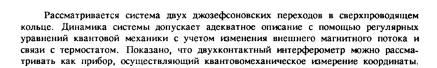 Рассматривается система двух джозефсоновских переходов в сверхпроводящем кольце. Динамика системы допускает адекватное описание с помощью регулярных уравнений квантовой механики с учетом изменения внешнего магнитного потока и связи с термостатом. Показано, что двухконтактный интерферометр можно рассматривать как прибор, осуществляющий квантовомеханическое измерение координаты.