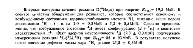 Впервые измерены сечения реакции Ό (Не,а) при энергии #вНев 19,3 МэВ. В спектре α-частиц обнаружены два резонанса, которые соответствуют основному и возбужденному состояниям ядернонестабильного изотопа 4Н, лежащие выше порога диссоциации 4Н—* t + η на 2,0 ± О.ЗМэВ и 5,2 ± 0,5МэВ. Сделано предположение, что возбужденное состояние 4Н имеет конфигурацию (d 2п) и квантовые характеристики 1 + . Факт ядерной неустойчивости 4Н (2,3 ± 0,3МэВ) подтвержден измерениями реакции 6Li(6Li,sB) при 1£бц" 85 и 93МэВ. В результате получено новое значение дефекта массы ядра 4Н, равное 25,3 ± 0,3МэВ.