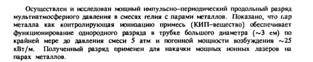 Осуществлен и исследован мощный импульсно-периодический продольный разряд мультиатмосферного давления в смесях гелия с парами металлов. Показано, что кар металла как контролирующая ионизацию примесь (КИП-вещество) обеспечивает функционирование однородного разряда в трубке большого диаметра (~3 см) по крайней мере до давления смеси 5 атм и погонной мощности возбуждения ~25 кВт/м. Полученный разряд применен для накачки мощных ионных лазеров на парах металлов.