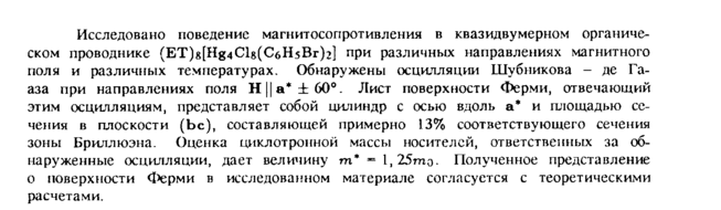 Исследовано поведение магнитосопротивления в квазидвумерном органическом проводнике (ET)8[Hg4Clg(C6H5Br)2] при различных направлениях магнитного поля и различных температурах. Обнаружены осцилляции Шубиикова де Гааза при направлениях поля Н||а* ±60°. Лист поверхности Ферми, отвечающий этим осцилляциям, представляет собой цилиндр с осью вдоль а* и площадью сечения в плоскости (Ьс), составляющей примерно 13% соответствующего сечения зоны Бриллюэна. Оценка циклотронной массы носителей, ответственных за обнаруженные осцилляции, дает величину m* = l,25mo. Полученное представление о поверхности Ферми в исследованном материале согласуется с теоретическими расчетами.