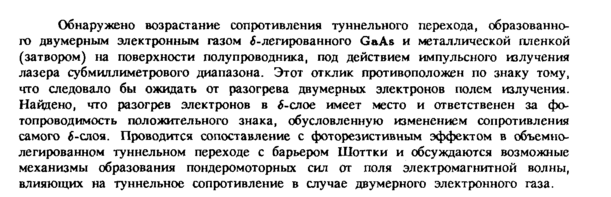 Обнаружено возрастание сопротивления туннельного перехода, образованного двумерным электронным газом ί-легированного GaAs и металлической пленкой (затвором) на поверхности полупроводника, под действием импульсного излучения лазера субмиллиметрового диапазона. Этот отклик противоположен по знаку тому, что следовало бы ожидать от разогрева двумерных электронов полем излучения. Найдено, что разогрев электронов в 6-слое имеет место и ответственен за фотопроводимость положительного знака, обусловленную изменением сопротивления самого 6-слоя. Проводится сопоставление с фоторезистивным эффектом в объемно-легированном туннельном переходе с барьером Шоттки и обсуждаются возможные механизмы образования пондеромоторных сил от поля электромагнитной волны, влияющих на туннельное сопротивление в случае двумерного электронного газа.