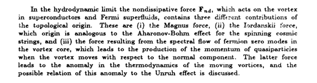 In the hydro dynamic limit the nondissipative force Tndt which acts on the vortex in superconductors and Fermi superfluids, contains three different contributions of the topological origin. These are (i) the Magnus force, (ii) the Iordanskii force, which origin is analogous to the Aharonov-Bohm effect for the spinning cosmic strings, and (Hi) the force resulting from the spectral flow of fermion zero modes in the vortex core, which leads to the production of the momentum of quasipartides when the vortex moves with respect to the normal component. The latter force leads to the anomaly in the thermodynamics of the moving vortices, and the possible relation of this anomaly to the Unruh effect is discussed.