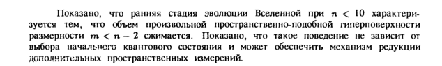 Показано, что ранняя стадия эволюции Вселенной при η < 10 характеризуется тем, что объем произвольной пространственно-подобной гиперповерхности размерности m < η — 2 сжимается. Показано, что такое поведение не зависит от выбора начального квантового состояния и может обеспечить механизм редукции дополнительных пространственных измерений.