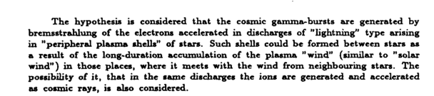 The hypothesis is considered that the cosmic gamma-bursts are generated by bremsstrahlung of the electrons accelerated in discharges of "lightning" type arising in "peripheral plasma shells" of stars. Such shells could be formed between stars as a result of the long-duration accumulation of the plasma "wind" (similar to "solar wind") in those places, where it meets with the wind from neighbouring stars. The possibility of it, that in the same dischargee the ions are generated and accelerated as cosmic rays, is also considered.