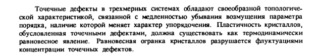 Точечные дефекты в трехмерных системах обладают своеобразной топологической характеристикой, связанной с медленностью убывания возмущения параметра порядка, наличие которой меняет характер упорядочения. Пластичность кристаллов, обусловленная точечными дефектами, должна существовать как термодинамически равновесное явление. Равновесная огранка кристаллов разрушается флуктуациями концентрации точечных дефектов.