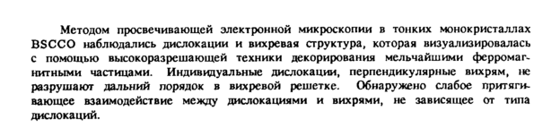Методом просвечивающей электронной микроскопии в тонких монокристаллах BSC С О наблюдались дислокации и вихревая структура, которая визуализировалась с помощью высокоразрешающей техники декорирования мельчайшими ферромагнитными частицами. Индивидуальные дислокации, перпендикулярные вихрям, не разрушают дальний порядок в вихревой решетке. Обнаружено слабое притягивающее взаимодействие между дислокациями и вихрями, не зависящее от типа дислокаций.