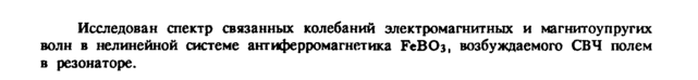 Исследован спектр связанных колебаний электромагнитных и магнитоупругих волн в нелинейной системе антиферромагнетика FeBOj, возбуждаемого СВЧ полем в резонаторе.