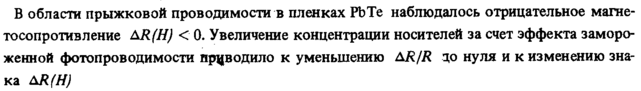 В области прыжковой проводимости в пленках РЬТе наблюдалось отрицательное магне-тосопротивление AR(H) < 0. Увеличение концентрации носителей за счет эффекта замороженной фотопроводимости приводило к уменьшению AR/R до нуля и к изменению знака AR(H)