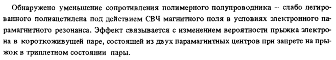 Обнаружено уменьшение сопротивления полимерного полупроводника слабо легированного поли ацетилена под действием СВЧ магнитного поля в условиях электронного парамагнитного резонанса. Эффект связывается с изменением вероятности прыжка электрона в коротко живущей паре, состоящей из двух парамагнитных центров при запрете на прыжок в триплетном состоянии пары.