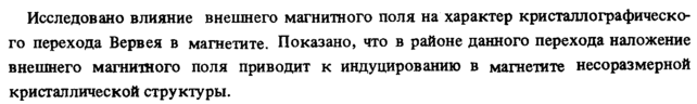 Исследовано влияние внешнего магнитного поля на характер кристаллографического перехода Вервея в магнетите. Показано, что в районе данного перехода наложение внешнего магнитного поля приводит к индуцированию в магнетите несоразмерной кристаллической структуры.