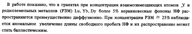 В работе показано, что в гранатах при концентрации взаимозамещающих атомов ,Υ и редкоземельных металлов (РЗМ) Lu, Yb, Dy более 5% неравновесные фрноны НФ распространяются преимущественно диффузионно. При концентрации РЗМ — 25% наблюдается аномальное увеличение длины свободного пробега НФ и их распространение может стать баллистическим.