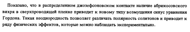 Показано, что в распределенном джозефсоновском контакте наличие абрикосовского вихря в сверхпроводящей пленке приводит к новому типу возмущения синус уравнения Гордона. Такая неоднородность позволяет различать полярность солитонов и приводит к ряду физических эффектов, которые можно наблюдать экспериментально.