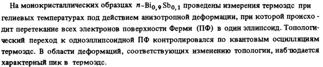 Ha mohoкристаллических образцах «-Bi0)9Sb0fi проведены измерения термоэдс при гелиевых температурах под действием анизотропной деформации, при которой происхо -дит перетекание всех электронов поверхности Ферми (ПФ) в один эллипсоид. Топологический переход к одно эллипсоидной ПФ контролировался по квантовым осцилляциям термоэдс. В области деформаций, соответствующих изменению топологии, наблюдается характерный пик в термоэдс.