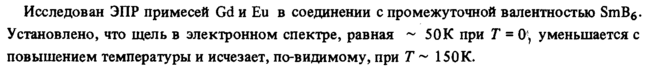 Исследован ЭПР примесей Gd и Eu в соединении с промежуточной валентностью SmB6. Установлено, что щель в электронном спектре, равная ~ 50К при Τ = 0!; уменьшается с повышением температуры и исчезает, по-видимому, при Τ ~ 150К.