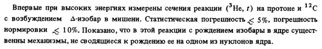 Впервые при высоких энергиях измерены сечения реакции ( Не, t) на протоне и С с возбуждением Δ-изобар в мишени. Статистическая погрешность^; 5%, погрешность нормировки ^ 10%. Показано, что в этой реакции с рождением изобары в ядре существенны механизмы, не сводящиеся к рождению ее на одном из нуклонов ядра.