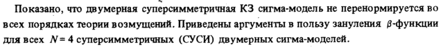 *4 Показано, что двумерная суперсимметричная КЗ сигма-модель не перенормируется во всех порядках теории возмущений. Приведены аргументы в пользу зануления 0-функции для всех N=4 суперсимметричных (СУСИ) двумерных сигма-моделей.