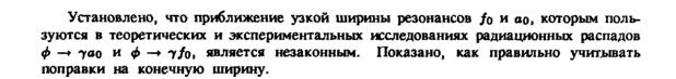 Установлено, что приближение узкой ширины резонансов /о и оо, которым пользуются в теоретических и экспериментальных исследованиях радиационных распадов Φ ~* уао и φ —► -yfo, является незаконным. Показано, как правильно учитывать поправки на конечную ширину.