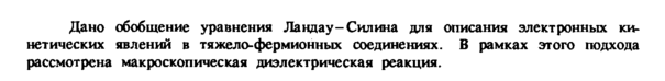 Дано обобщение уравнения Ландау-Силина для описания электронных кинетических явлений в тяжело-фермионных соединениях. В рамках этого подхода рассмотрена макроскопическая диэлектрическая реакция.