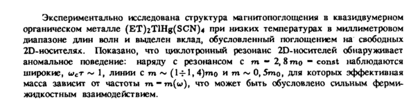 Экспериментально исследована структура магнитопоглощения в квазидвумерном органическом металле (ET)zTlHg(SCN)4 при низких температурах в миллиметровом диапазоне длин волн и выделен вклад, обусловленный поглощением на свободных 2D-носителях. Показано, что циклотронный резонанс 2D-носителей обнаруживает аномальное поведение: наряду с резонансом с m 2,8 mo ~ const наблюдаются широкие, юст ~ 1, линии с m ~ (14-1,4)то и т ~ 0,5то, для которых эффективная масса зависит от частоты m — m(u>), что может быть обусловлено сильным ферми-жидкостным взаимодействием.