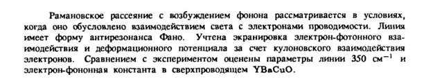 Рамановское рассеяние с возбуждением фонона рассматривается в условиях, когда оно обусловлено взаимодействием света с электронами проводимости. Линия имеет форму антирезонанса Фано. Учтена экранировка электрон-фотонного взаимодействия и деформационного потенциала за счет кулоновского взаимодействия электронов. Сравнением с экспериментом оценены параметры линии 350 см-1 и электрон-фононная константа в сверхпроводящем YBaCuO.