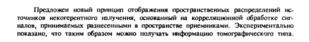 Предложен новый принцип отображения пространственных распределений источников некогерентного излучения, основанный на корреляционной обработке сигналов, принимаемых разнесенными в пространстве приемниками. Экспериментально показано, что таким образом можно получать информацию томографического типа.