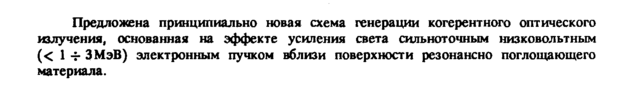 Предложена принципиально новая схема генерации когерентного оптического излучения, основанная на эффекте усиления света сильноточным низковольтным (< 1 -г ЗМэВ) электронным пучком вблизи поверхности резонансно поглощающего материала.