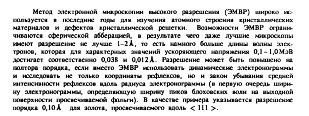 Метод электронной микроскопии высокого разрешения (ЭМВР) широко используется в последние годы для изучения атомного строения кристаллических материалов и дефектов кристаллической решетки. Возможности ЭМВР ограничиваются сферической абберацией, в результате чего даже лучшие микроскопы имеют разрешение не лучше 1-2А, то есть намного больше длины волны электронов, которая для характерных значений ускоряющего напряжения 0,1-1,0МэВ достигает соответственно 0,038 и 0,012А. Разрешение может быть повышено на полтора порядка, если вместо ЭМВР использовать динамические электронограммы и исследовать не только координаты рефлексов, но и закон убывания средней интенсивности рефлексов вдоль радиуса электронограммы (в первую очередь ширину электронограммы, определяющую ширину пиков блоховских волн на выходной поверхности просвечиваемой фольги). В качестве примера указывается разрешение порядка 0,10 А для золота, просвечиваемого вдоль < 111 >.