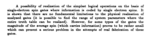 A possibility of realization of the simplest logical operations on the basis of single-electron spin gates where information is coded by single electron spins. It is shown that there are no fundamental limitations to the physical realization of analyzed gates (it is possible to find the range of system parameters where the entire truth table can be realized). However, for some types of the gates the magnitude of the average spin (which carries information) proves to be rather small which can present a serious problem in the attempts of real fabrication of these gates.