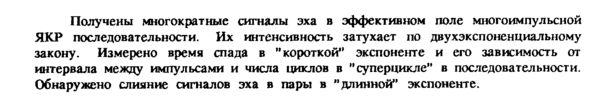 Получены многократные сигналы эха в эффективном поле многоимпульсной ЯКР последовательности. Их интенсивность затухает по двухэкспоненциальному закону. Измерено время спада в "короткой" экспоненте и его зависимость от интервала между импульсами и числа циклов в "суперцикле" в последовательности. Обнаружено слияние сигналов эха в пары в "длинной" экспоненте.