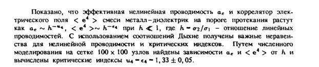 Показано, что эффективная нелинейная проводимость ае и коррелятор электрического поля < е4 > смеси металл-диэлектрик на пороге протекания растут как ое К~*4, < е4 >~ К-'4 при h < 1, где Η~σι/σ\ отношение линейных проводимостей. С использованием соотношений Дыхне получены важные неравенства для нелинейной проводимости и критических индексов. Путем численного моделирования на сетке 100 χ 100 узлов найдены зависимости ае и < е4 > от h и вычислены критические индексы U4 €4 — 1,33 ± 0,05.