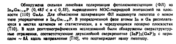 Обнаружена сильная линейная поляризация фотолюминесценции (ФЛ) из In»G»i„P (0,4*5 < * < 0,55), выращенного МОС-гидридной эпитаксией на плоскости (НО) GaAfДля объяснения поляризации ФЛ выдвинута гипотеза о новом типе упорядочения в Xa*Gai^«P. В упорядоченной фазе атомы Хд и G& располагаются ■ местах катионов не статистически, а в чередующихся попарно плоскостях (TlO), В ходе рентгенографических исследований были обнаружены сверхструктурные отражения, соответствующие двухслойной сверхрешетке (Ь*Р)г(ОаР)? с периодом ~ |А вдоль направления [ГЮ], что подтверждает нашу гипотезу,