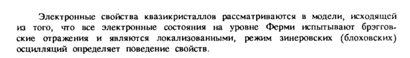 Электронные свойства квазикристаллов рассматриваются в модели, исходящей из того, что все электронные состояния на уровне Ферми испытывают брэггов-ские отражения и являются локализованными, режим зинеровских (блоховских) осцилляций определяет поведение свойств.