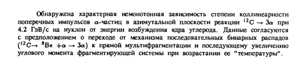 Обнаружена характерная немонотонная зависимость степени коллинеарности поперечных импульсов α-частиц в азимутальной плоскости реакции 12С —» За при 4.2 ГэВ/с на нуклон от энергии возбуждения ядра углерода. Данные согласуются с предположением о переходе от механизма последовательных бинарных распадов (,2С—* 8Ве -fa —* За) к прямой мультифрагментации и последующему увеличению углового момента фрагментирующей системы при возрастании ее "температуры".