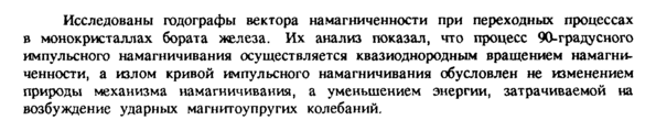 Исследованы годографы вектора намагниченности при переходных процессах в монокристаллах бората железа. Их анализ показал, что процесс 90-градусного импульсного намагничивания осуществляется квазиоднородным вращением намагниченности, а излом кривой импульсного намагничивания обусловлен не изменением природы механизма намагничивания, а уменьшением энергии, затрачиваемой на возбуждение ударных магнитоупругих колебаний.