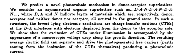 We predict a novel photovoltaic mechanism in donor-accept or superlattices. We consider an asymmetrical organic superlattice such as...D-A-N-D-A-N-D-A' JV...P where D,A and JV indicate layers of materials which are, respectively, donor, acceptor and neither donor nor acceptor, all neutral in the ground state. In such a structure, the lowest lying electronic excitations are charge-transfer excitons (CTEs) at the D-A interfaces with electrons displaced from the donor to the acceptor side. We show that the excitation of CTEs under illumination is accompanied by the appearance of a macroscopic voltage drop along the growth direction. The resulting average electric Held can separate and drive the photogencrated free carriers (partly coming from the ionization of the CTEs themselves) producing a photovoltaic current.