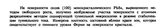 На поверхности скола (100) монокристаллического PbSc, выращенного методом свободного роста, получено изображение участка поверхности с атомным разрешением методом сканирующей туннельной микроскопии в режиме стабилизации туннельного тока. Измерена плотность состояний вблизи краев зон, которая свидетельствует о пиннинге уровня Ферми на поверхности кристалла.