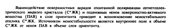 Взаимодействие поверхностных зарядов спонтанной поляризации сегнетоэлек-трического жидкого кристалла (С*ЖК) и подвижных ионов поверхностно-активного вещества (ПАВ) в слое ориентанта приводит к возникновению моностабильного отклика С*ЖК, Источником моностабильности является внутреннее поле в объеме С*ЖК от ионов ПАВ в объеме слоя ориентанта.