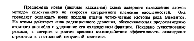 Предложена новая (двойная каскадная) схема лазерного охлаждения атомов методом селективного по скорости когерентного пленения населенностей. Она позволяет охлаждать ниже предела отдачи четно-четные изотопы ряда элементов. На атомы действует сила радиационного давления, обеспечивающая предохлаждение атомного ансамбля и удержание его охлажденной фракции. Показано существование режима, в котором с ростом времени взаимодействия эффективность охлаждения стремится к постоянной ненулевой величине.