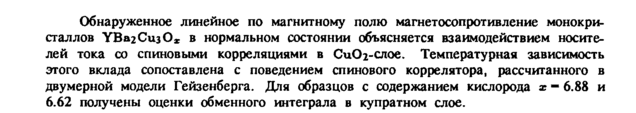 Обнаруженное линейное по магнитному полю магнетосопротивление монокристаллов УВагСизО* в нормальном состоянии объясняется взаимодействием носителей тока со спиновыми корреляциями в СиОг-слое. Температурная зависимость этого вклада сопоставлена с поведением спинового коррелятора, рассчитанного в двумерной модели Гейзенберга. Для образцов с содержанием кислорода χ 6.88 и 6.62 получены оценки обменного интеграла в купратном слое.