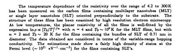 The temperature dependence of the resistivity over the range of 4.2 to 300 К has been measured on the carbon films containing multilayer nanotubes (MLX) or single layer nanotubes (SLT) oriented perpendicularly to the substrate. The structure of these films has been examined by high resolution electron microscopy. At low temperatures, the planar resistivity of all the films is well-fitted by the expression In? ос [Го/Г]1'*1 with η 4 and Го ~ Ю6К for the MLT funis, but with η " 2 and To ~ 20 К for the films containing the bundles of SLT of 0.71 nm in diameter. The data obtained are considered in terms of the variable-range hopping conductivity. The estimations made show a fairly high density of states at the Fermi level (~ 1021 eV-1 cm-3) for the films containing SLT's.