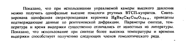 Показано, что при использовании управляемой камеры высокого давления можно получить однофазные высшие гомологи ртутных ВТСП-купратов. Синтезирована однофазная сверхпроводящая керамика HgBa2Ca3Cu40io+x, приведены подтверждающие данные по рентгеновской дифракции. Параметры синтеза, температура и время выдержки существенно отличались от известных из литературы. Показано, что использование при синтезе более высоких температуры и времени, выдержки способствует получению следующих членов гомологического ряда.