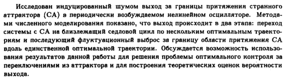 Исследован индуцированный шумом выход за границы притяжения странного аттрактора (СА) в периодически возбуждаемом нелинейном осцилляторе. Методами численного моделирования показано, что выход происходит в два этапа: переход системы с С А на близлежащий седловой цикл по нескольким оптимальным траекториям и последующий флуктуационный выброс за границу области притяжения СА вдоль единственной оптимальной траектории. Обсуждается возможность использования результатов данной работы для решения проблемы оптимального контроля за переключениями из аттрактора и для построения теоретических оценок вероятности выхода.