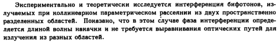 Экспериментально и теоретически исследуется интерференция бифотонов, излучаемых при коллинеарном параметрическом рассеянии из двух пространственно разделенных областей. Показано, что в этом случае фаза интерференции определяется длиной волны накачки и не требуется выравнивания оптических путей для излучения из разных областей.