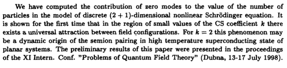 We have computed the contribution of zero modes to the value of the number of particles in the model of discrete (2 + l)-dimensional nonlinear Schrodinger equation. It is shown for the first time that in the region of small values of the CS coefficient к there exists a universal attraction between field configurations. For к — 2 this phenomenon may be a dynamic origin of the semion pairing in high temperature superconducting state of planar systems. The preliminary results of this paper were presented in the proceedings of the XI Intern. Conf. "Problems of Quantum Field Theory" (Dubna, 13-17 July 1998).