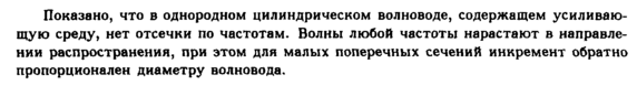 Показано, что в однородном цилиндрическом волноводе, содержащем усиливающую среду, нет отсечки по частотам. Волны любой частоты нарастают в направлении распространения, при этом для малых поперечных сечений инкремент обратно пропорционален диаметру волновода.