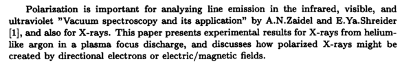 Polarization is important for analyzing line emission in the infrared, visible, and ultraviolet "Vacuum spectroscopy and its application" by A.N.Zaidel and E.Ya.Shreider [1], and also for X-rays. This paper presents experimental results for X-rays from heliumlike argon in a plasma focus discharge, and discusses how polarized X-rays might be created by directional electrons or electric/magnetic fields.