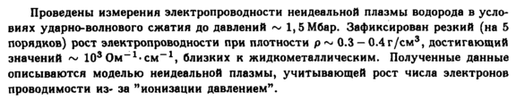 Проведены измерения электропроводности неидеальной плазмы водорода в условиях ударно-волнового сжатия до давлений ~ 1, 5 Мбар. Зафиксирован резкий (на 5 порядков) рост электропроводности при плотности р~ 0.3 0.4г/см3, достигающий значений ~ 103 Ом-1-см-1, близких к жидкометаллическим. Полученные данные описываются моделью неидеальной плазмы, учитывающей рост числа электронов проводимости изза "ионизации давлением".