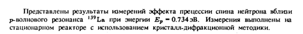 Представлены результаты измерений эффекта прецессии спина нейтрона вблизи р-волнового резонанса l39La при энергии Ер 0.734эВ. Измерения выполнены на стационарном реакторе с использованием кристалл-дифракционной методики.