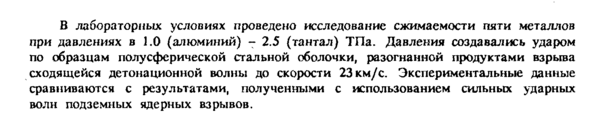 В лабораторных условиях проведено исследование сжимаемости пяти металлов при давлениях в 1.0 (алюминий) 2.5 (тантал) ТПа. Давления создавались ударом по образцам полусферической стальной оболочки, разогнанной продуктами взрыва сходящейся детонационной волны до скорости 23 км/с. Экспериментальные данные сравниваются с результатами, полученными с использованием сильных ударных волн подземных ядерных взрывов.