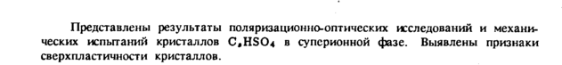 Представлены результаты поляризационио-оптических исследований и механических испытаний кристаллов CHSO4 в суперионной фазе. Выявлены признаки сверхпластичности кристаллов.